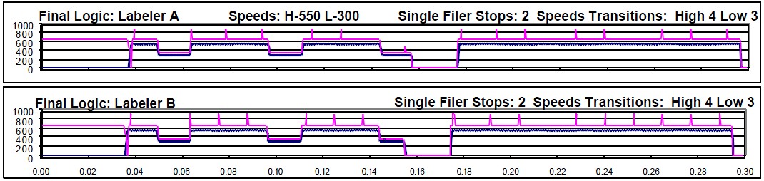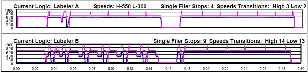 Using the PolySim process, we adjusted the controls to balance the system. Changing the timers on photo-eye PE4510 to match eye PE4512 stabilized single filer B. Now however, the graph in figure 2 shows both labelers running worse.