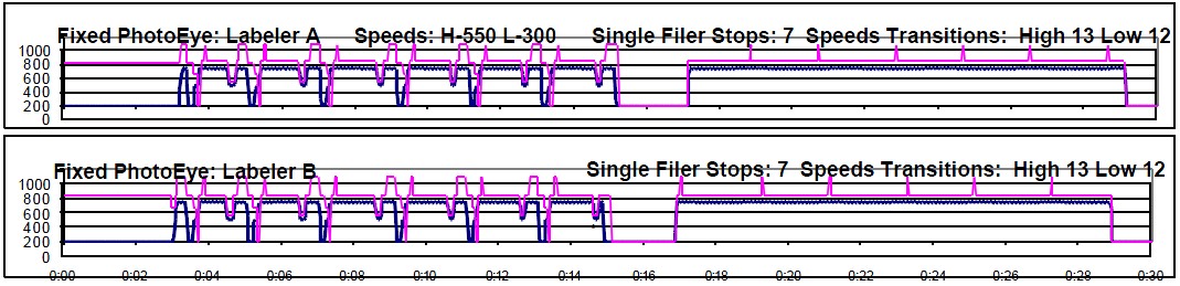 Analyzing the graph, we found that the labeler’s low speeds were only being used for 10 seconds before they stopped due to low prime. We consequently changed the low speed eye to one 10 feet further up stream, allowing the labelers to move into low speed long enough to avoid stopping. The optimized system is shown below in figure 3. Now both labelers drop to low speed three times during low prime, but don’t stop. At this point we are ready to make the logic changes, but there is a question as to whether the single filers can run efficiently with the labelers at 300 bpm. They were designed to range from 400 bpm to 1200 bpm, which isn’t ideal for current running conditions. However, they seem to run fine if the in-feed conveyor to each single filer is restricted to 300 bpm. On Friday 3/2/2001, we are going to test this method. If it works, we can avoid regearing the single filers, saving $15,000. If not, we’ve already prepared the order to get the necessary parts from Alliance.