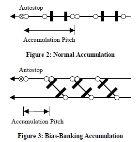 Normal accumulation (Figure 2) occurs when the leading trolley of a carrier encounters the third trolley of a previous carrier. Bias-banking accumulation (Figure 3) occurs when the leading trolley encounters the second trolley of a previous carrier (with the third trolley diverted to a separate path). The accumulation pitch is the distance between two successive, accumulated carriers.