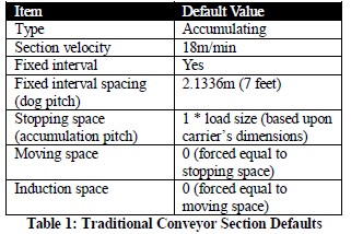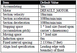 Originally, AutoMod provided a single set of defaults for all conveyor sections within a single movement system. Since delivery chain is both the most common type of conveyor, and the most consistent in terms of configuration, the relevant system defaults were set as indicated in Table 1.