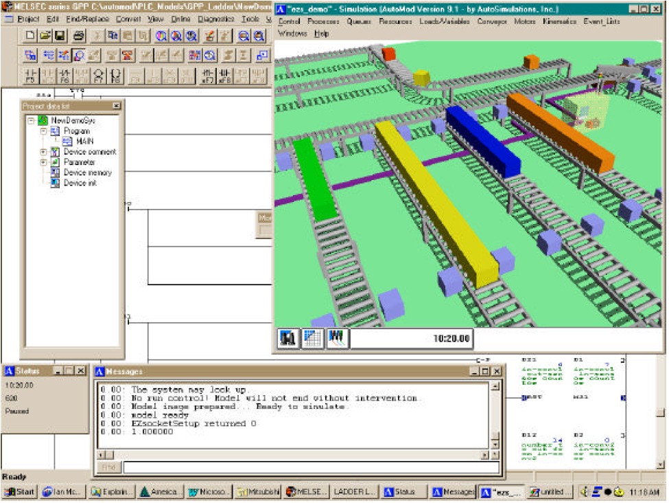 Figure 1: The Mitsubishi project, showing the ladder logic controller in the background and the AutoMod sawtoothmerge model in the foreground.