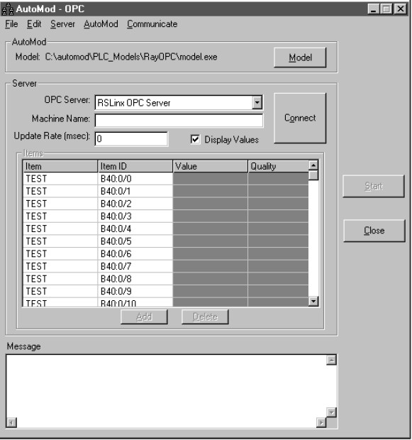 implemented as a stand-alone utility (Figure 2) which connects an AutoMod model to an OPC server. Models can be connected to local servers or servers located anywhere on a network. Once the concept had been satisfactorily proven the full implementation of OPC as an integral part of the simulation product was undertaken. This implementation in C++ offered several important benefits; the most important of which was speed of communication. This gain in speed was not only due to the differences in performance between VB and C++ but also due to the fact that by communicating directly from the model to the OPC server, the model effectively becomes the OPC client. This removes a layer of communication that had previously existed when the model communicated with the OPC server through the VB OPC client. This implementation now takes the form of functions that are called from within the model, which operates in exactly the same way as described earlier. A further important reason for implementing the OPC functions within the model is that this approach enables the use of AutoStat, a utility to create and execute batch runs and collate the results.