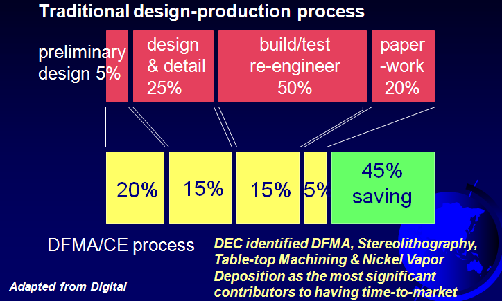 Analysis of hundreds of DFMA case studies reveal, on average, a 42% reduction in labor costs, a 54% reduction in parts, a 60% reduction in assembly time, a 45% reduction in product development cycles, and a 50% reduction in cost.